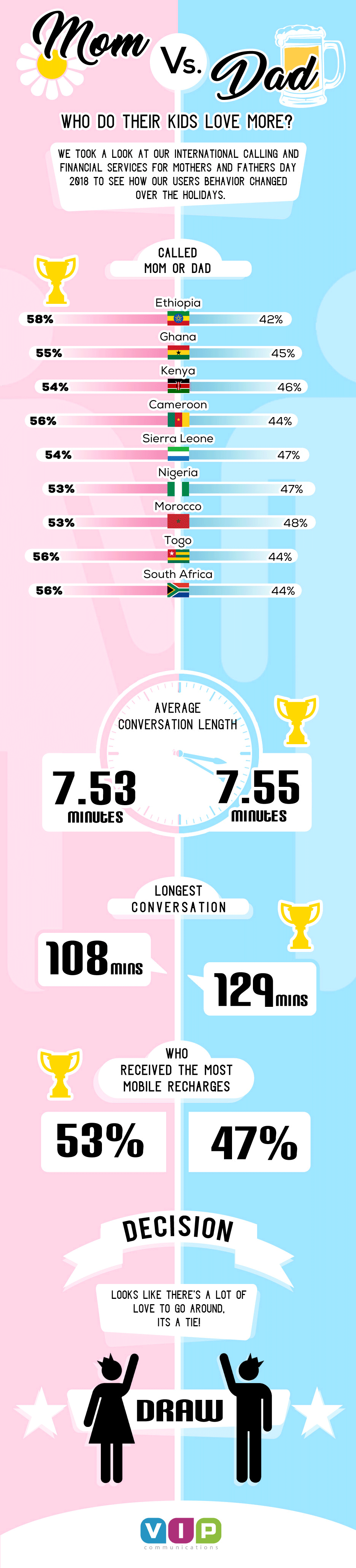 Here at VIP, we gathered information from our international calling and financial services for Mother’s and Father’s Day 2018 to see how our users behavior changed over the holidays. We were curious if we could draw conclusions and maybe figure out who does their kids love more - Mom or Dad? We knew this would be an interesting topic to cover. Here’s a cool infographic that highlights our findings!
