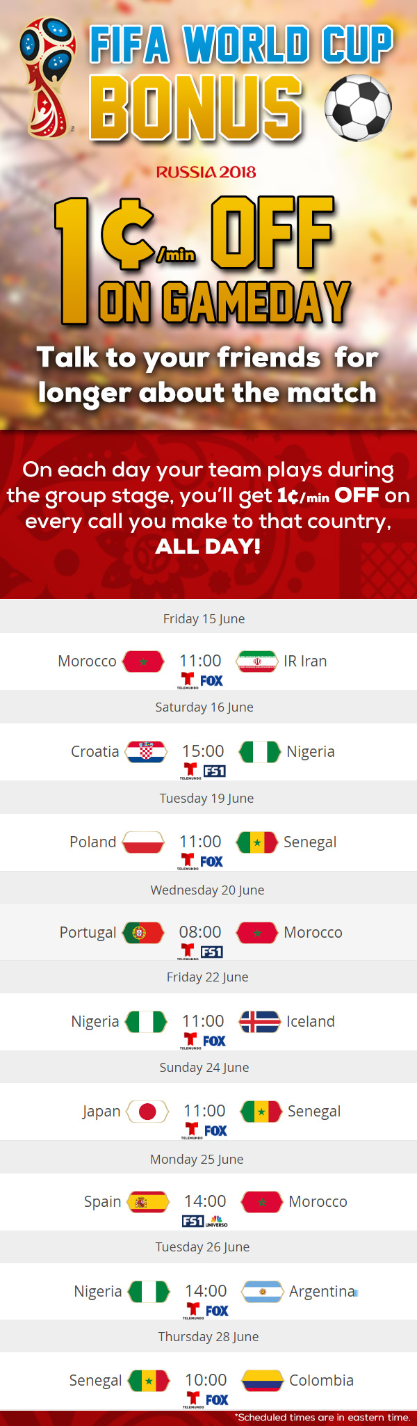 - 1¢/min OFF is only valid for Nigeria, Morocco, and Senegal for accounts on a standard rate plan from 12:00 am - 11:59 pm ET on each game day during the group stage.